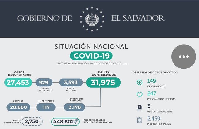 El Gobierno del Presidente Nayib Bukele atravez del Ministerio de Salud informa da hoy Reporte sobre la situacion sobre el hecho de pruebas que se realizaron el dia Lunes 19 de Octubre