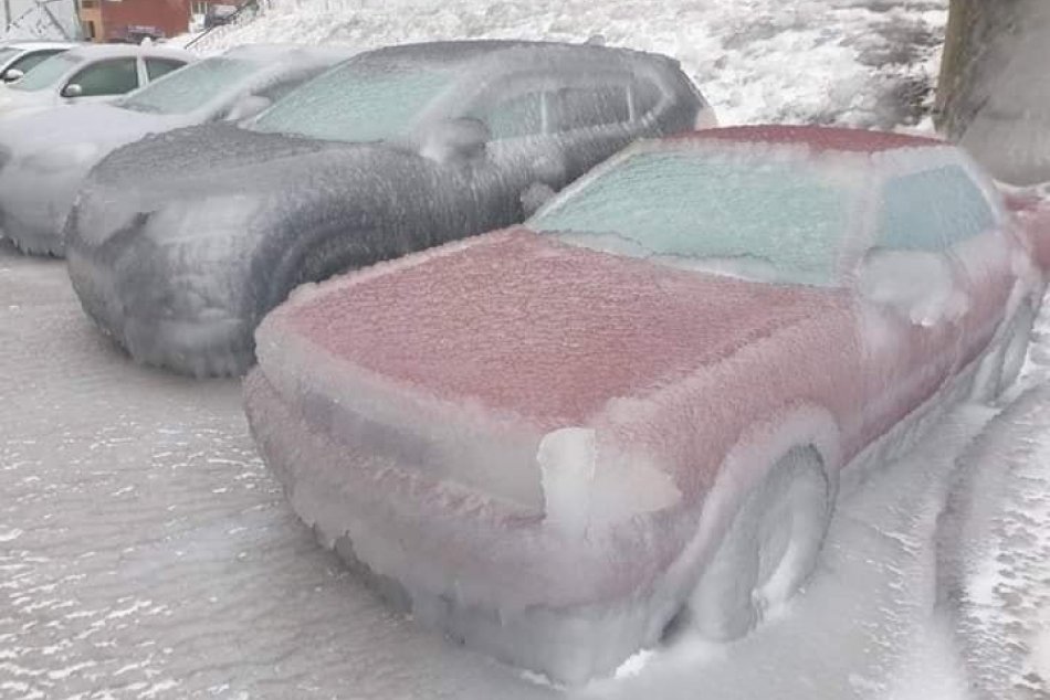 Capas gruesas de árboles, automóviles y carreteras cubiertos de hielo, con líneas eléctricas que rompen el hielo en algunos lugares.