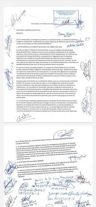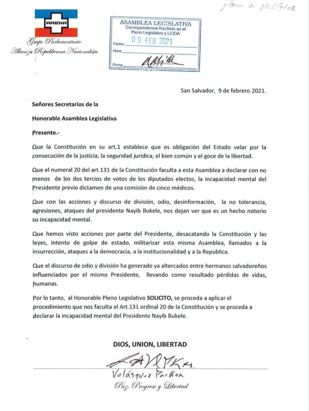 Durante la mañana de la sesión plenaria, los diputados através del Díputado Ricardo Velázquez Parker, donde promovió una pieza de correspondencia en la que pedía , remover al Presidente Nayib Bukele, ya que según el argumento, hecho por el Legislador, se dice que el Mandatario, tiene una incapacidad mental , para Gobernar y de impulsar mensaje de odio.