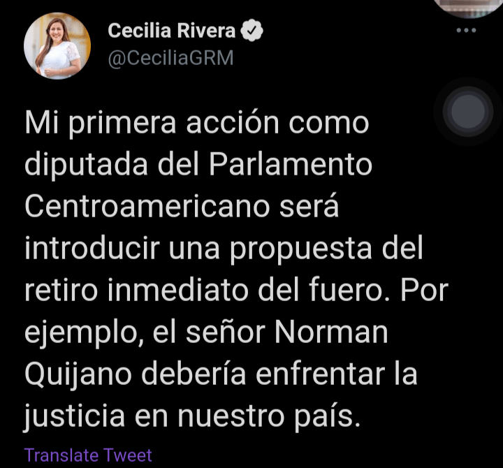 Por esta la Diputada Electa Cecilia Rivera, a dicho que una de sus primeras acciones dentro del Parlamento Centroamericano, será presentar una solicitud de retirarle el fuero , en la cual señaló al Diputado Norman Quijano, debe enfrentar la justicia en el país.