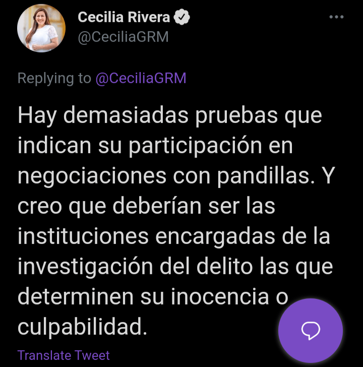 Deja entre ver qué el Díputado Norman Quijano, tiene muchas evidencia en su contra de haber negociado con Pandilleros, pero resalto que las instituciones son las encargadas de la investigación del delito que se le atribuye , las que puedan declarar su inocencia o culpabilidad, expreso Cecilia Rivera.
