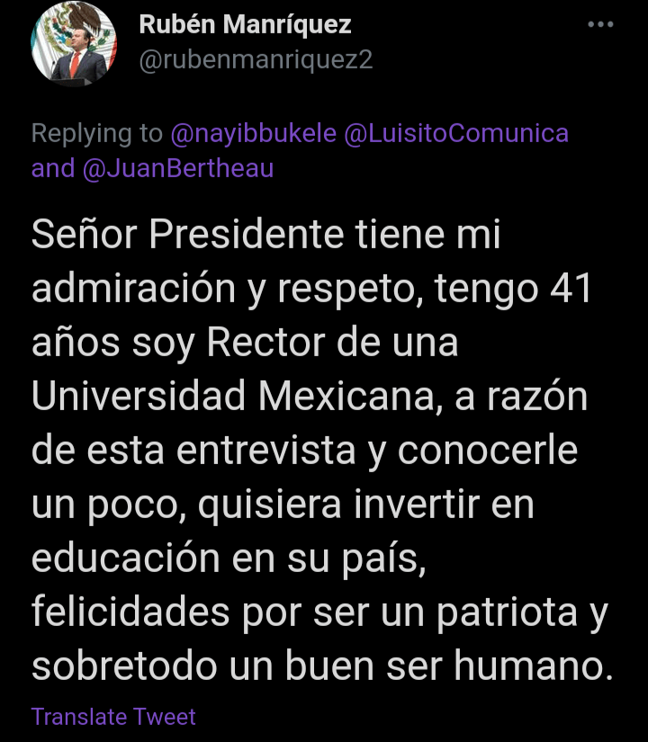 ” Señor Presidente tiene mi admiración y respeto, soy rector de una Universidad Mexicana ,a razón de entrevista y conocerle un poco, quisiera invertir en educación en su pais, felicidades por ser un patriota y sobretodo un buen ser humano , expreso , Rubén Manríquez Rector de Universidad autónoma Mexicana UNAM mediante su Cuenta Twitter.