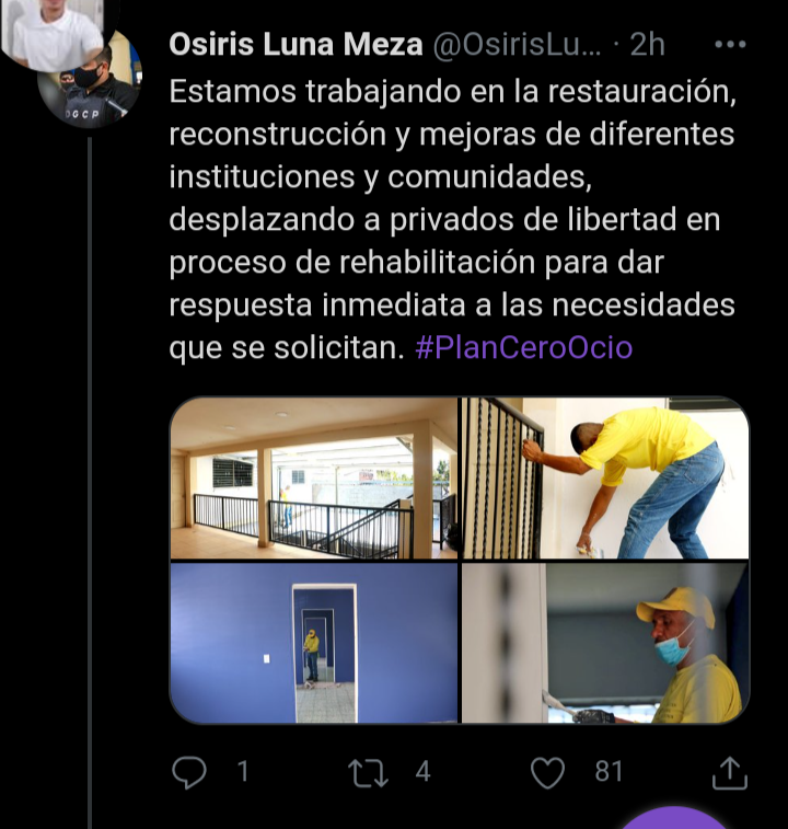 En este el ViceMinistro de Justicia y Centros Penales , Osiris Luna Meza, a informado este día, que privados de libertad atraves del plan cero ocio, que genera la oportunidad para reos en poder desarrollarse y poder entrar a la etapa de rehabilitación, y después de cumplí con su condena poder incorporarse a la Sociedad Civil.