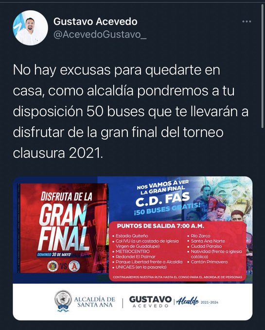 Atráves de su cuenta de Twitter manifestado ” No hay Excusas para quedarte en Casa ” luego que el equipo santaneco clasificara a la Final.